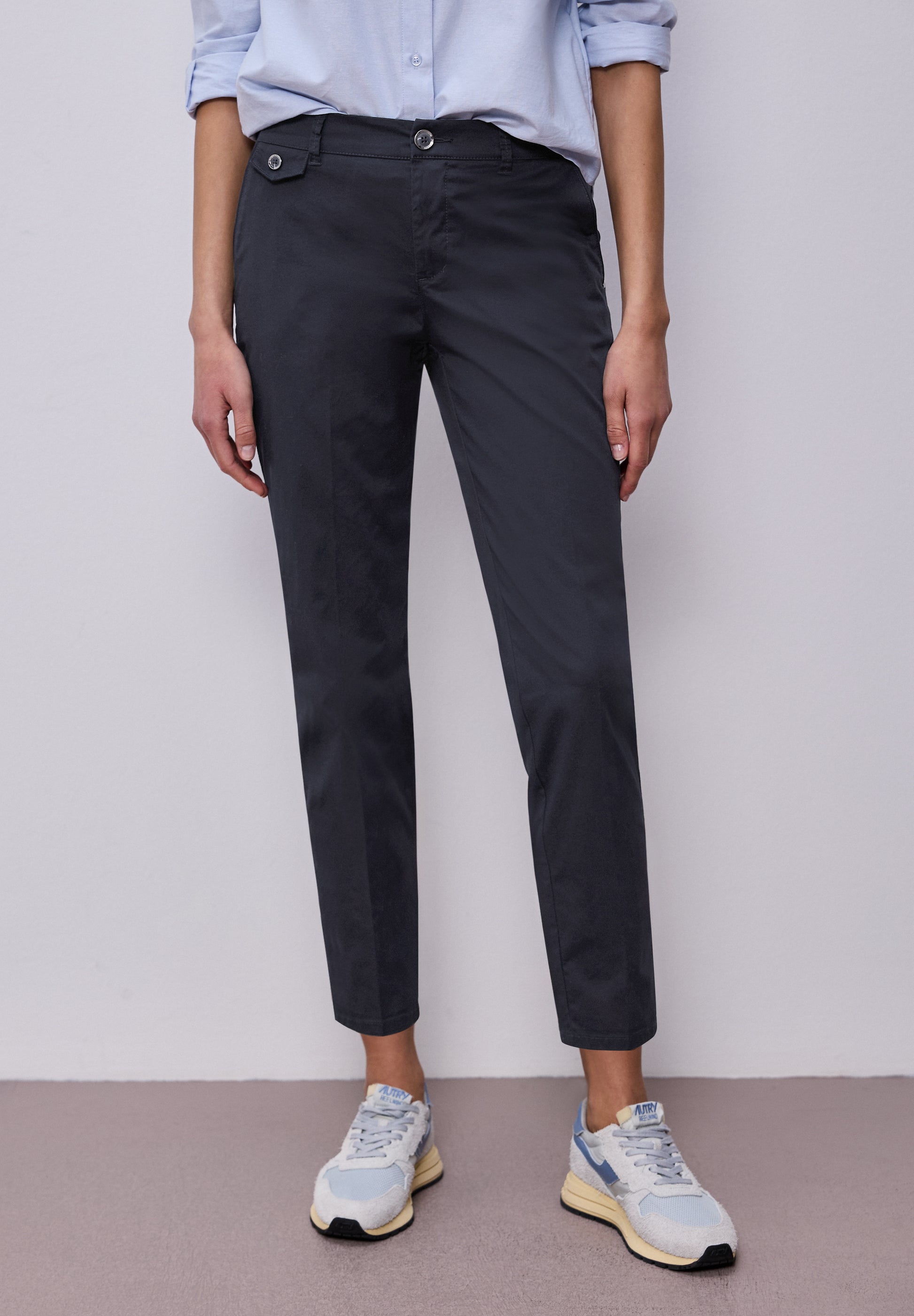 Kombiniere diese Chino mit einem feinen Strickpullover oder einem lässigen Shirt von Street One für einen modernen Casual-Look. Für einen smarten Office-Look ergänze sie mit Blazer und Loafers, für entspannte Wochenend-Looks wirken Sneaker besonders harmonisch.